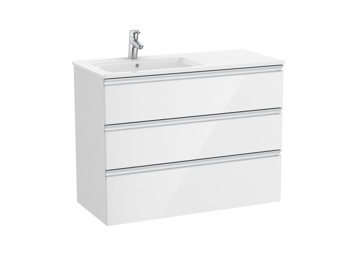 UNIK, MUEBLE Y LAVABO, MODELO GAP 3 CAJONES BLANCO BRILLO CON LAVABO DESPLAZADO A LA IZQUIERDA. MEDIDA 1000X460