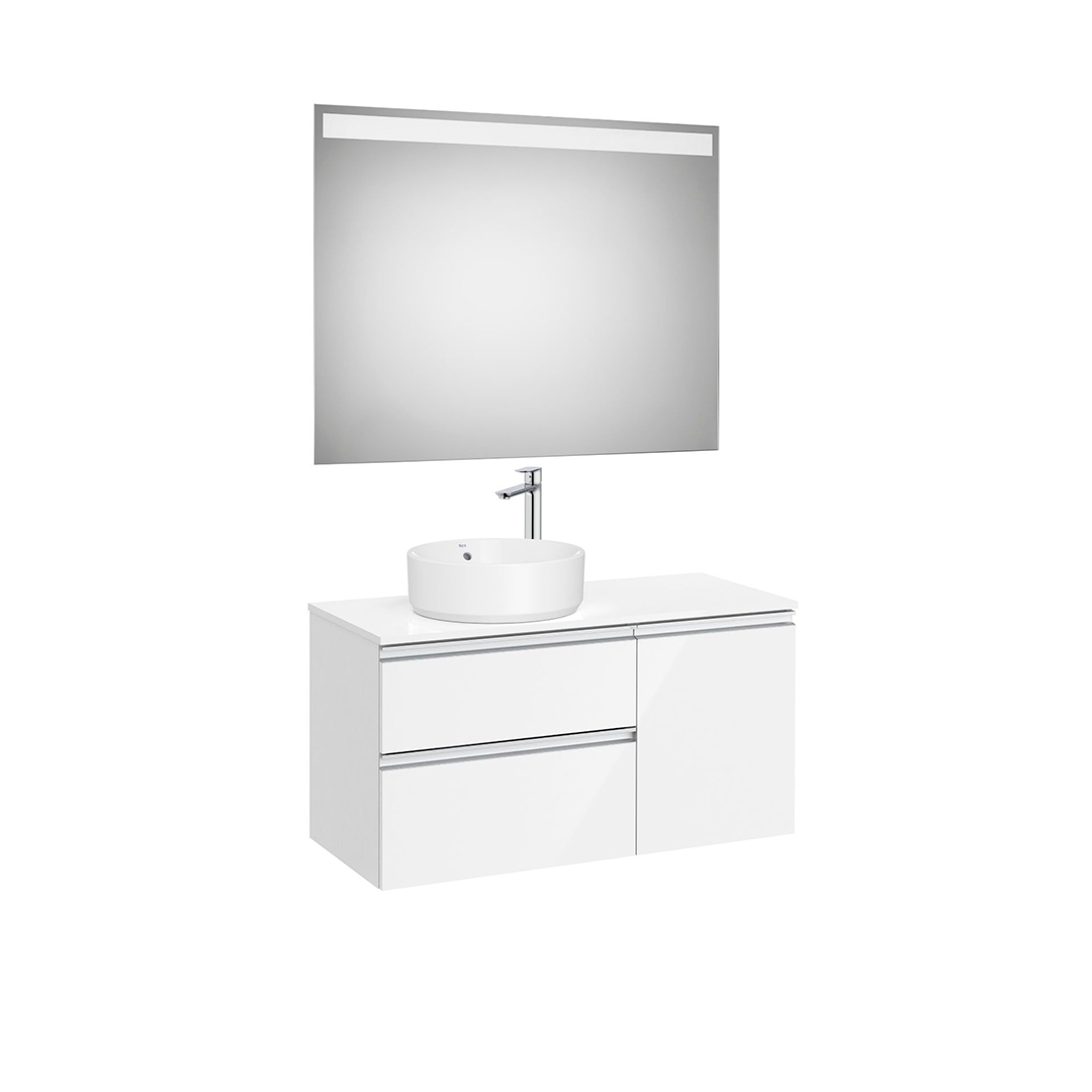 PACK MUEBLE ESPEJO Y LAVABO MODELO GAP 2 CAJONES y 1 PUERTA BLANCO BRILLO PARA LAVABO SOBREENCIMERA DESPLAZADO A LA IZQUIERDA MEDIDA 1000X460