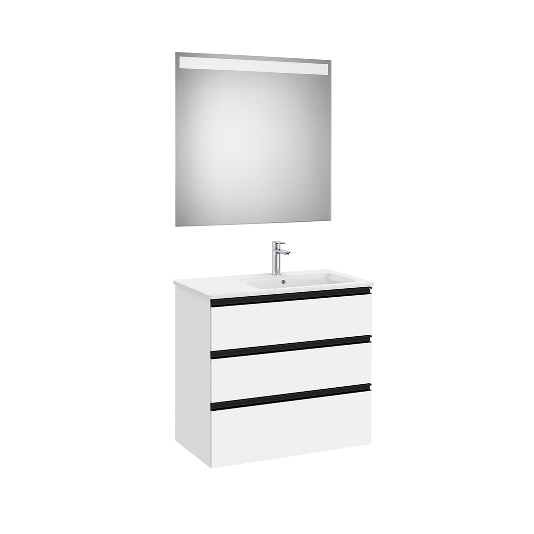 PACK, MUEBLE LAVABO Y ESPEJO, MODELO GAP 3 CAJONES ACABADO BLANCO MATE Y LAVABO DESPLAZADO A LA DERECHA. MEDIDA 800X460